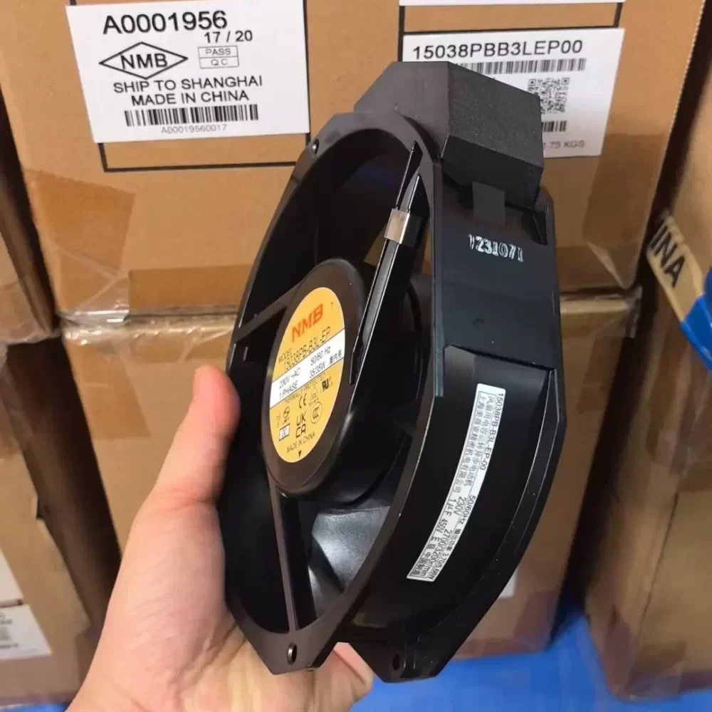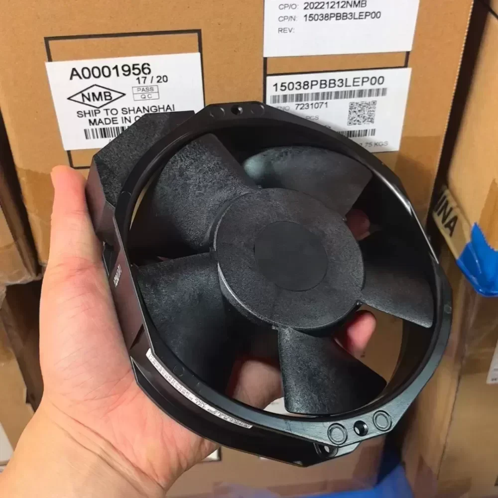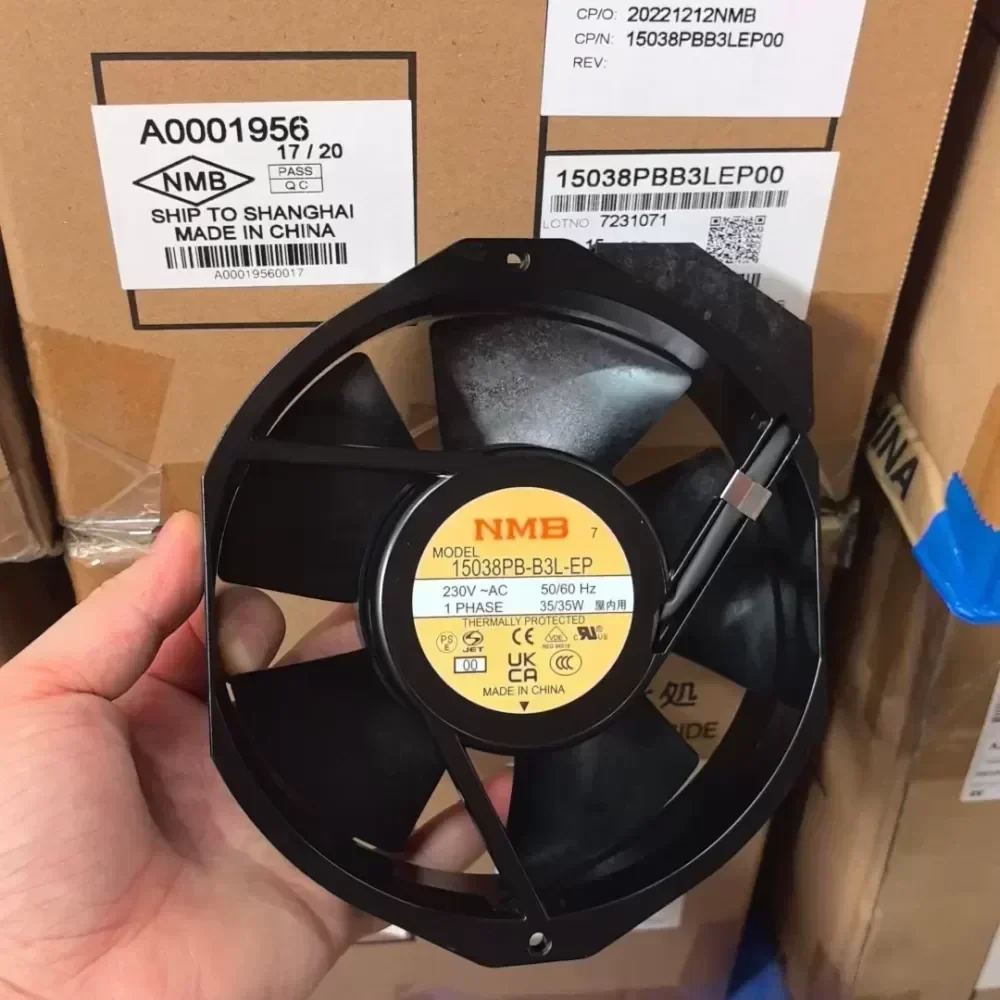 The new NMB original cooling fan 15038PB-B3L-EP, 230V single-phase 35W power, with overheating protection, suitable for cabinet or industrial use. Made in China, reliable quality, special price treatment for inventory clearing, price can be negotiated. Self-picked up in the same city and free shipping in other places. Welcome to inquire!